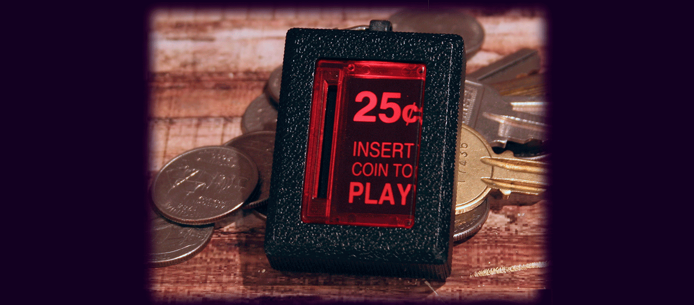 RepliCade Insert Coin keychains are constructed from a traditional blend of diecast metal and plastic. Push the coin return button to activate LED illumination for 10 seconds. This 1:1 scale arcade-accurate replica metal coin return key chain stands 2" tall and weighs in at a whopping 3.2 ozs.