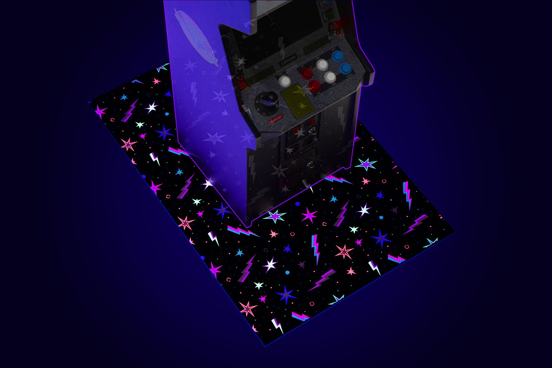 Our RepliCade UV Base Pads feature arcade carpet inspired graphics with silk screened UV reactive ink in 1:6 scale on a soft fiber surface, with neoprene core & anti-slip rubber base. At a total size of 8” x 12”, use it as a mouse pad or put it under your RepliCade Mini Arcade Machine for the ultimate statement!